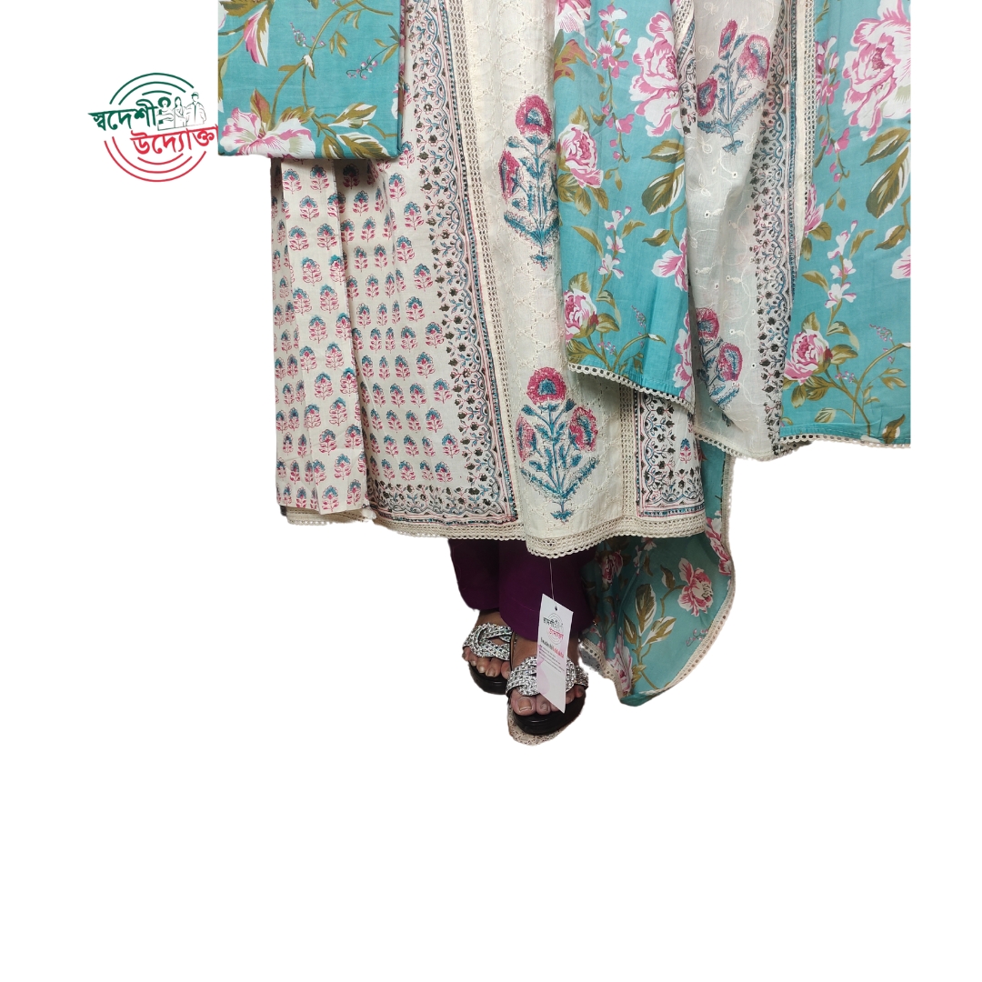 এক্সপোর্ট কোয়ালিটির সম্পূর্ণ সুতি থ্রি-পিস, চিকেন কারির মনোমুগ্ধকর কাজের সাথে এখন আপনার হাতের নাগালে!