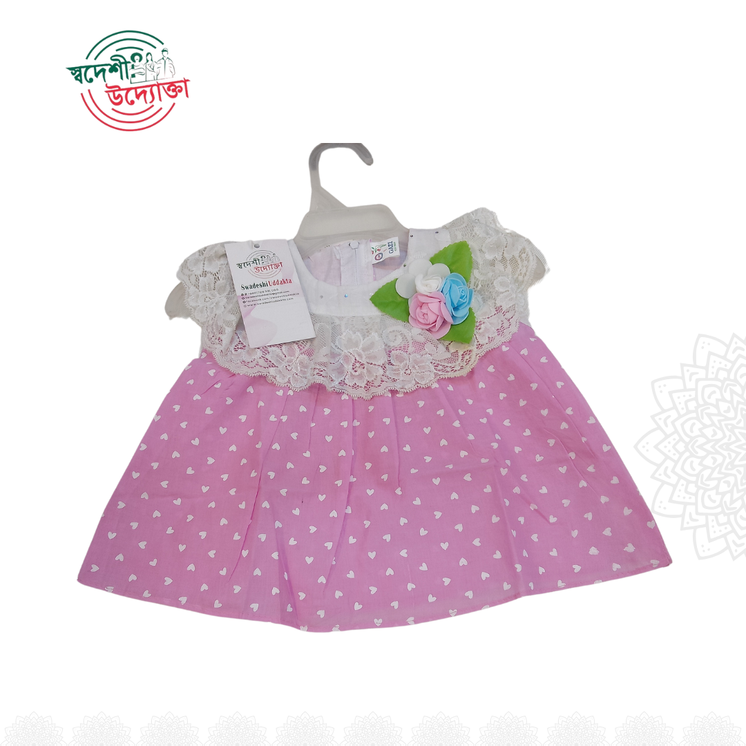 Dress your little girl in this adorable Heart Print Baby Dress, made from 100% cotton for ultimate comfort. The pink dress features a lovely white heart pattern, a delicate lace border on the chest, and a floral accent, making it perfect for any occasion. Available in various sizes, this comfortable and stylish dress is priced at just 280 Taka. Ideal for parents looking for quality, affordable baby clothing that combines cuteness and practicality.