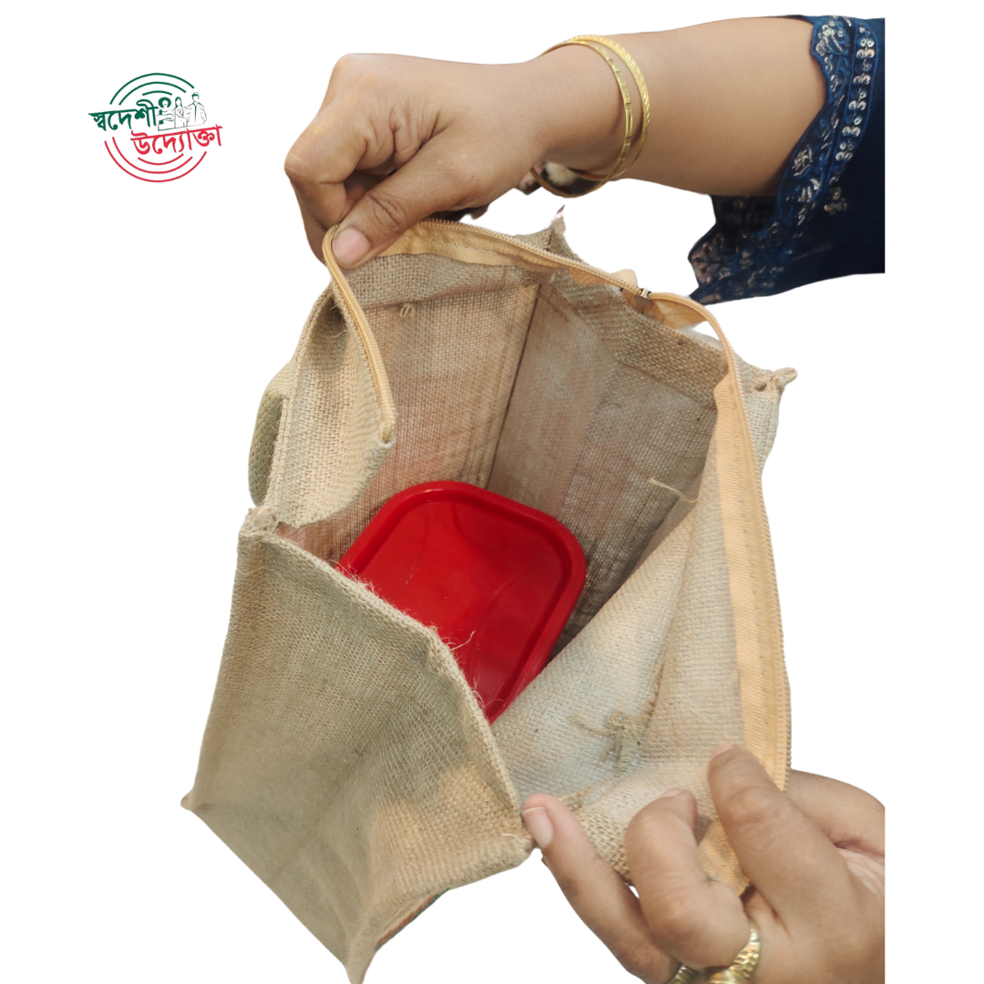 This jute tiffin bag is a sustainable choice, ideal for carrying food and water bottles on journeys or daily commutes. The natural jute color and floral print add a touch of rustic charm, while its lightweight and durable design ensure practicality.